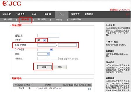 JCG产品有针对优先权的QOS设置,也有针对IP地址的限速。这里以JHR-N926R为例为大家讲讲基于优先权的限速。