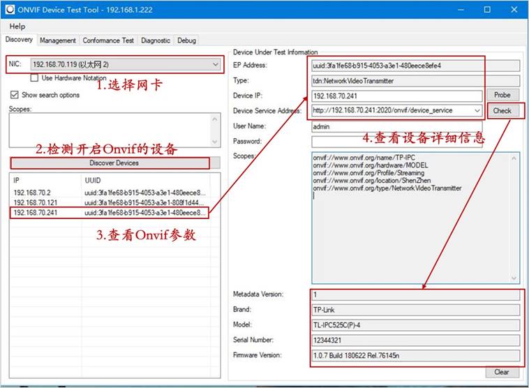 1. 打开Onvif Device Test Tool测试软件,在【NIC】中选择与摄像机同一网段的网卡;